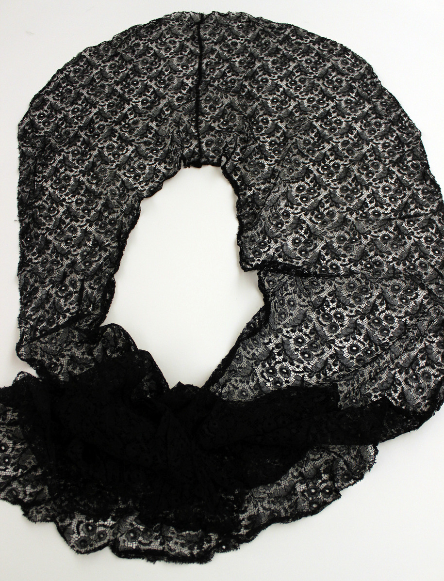 Black lace mourning veil. Circular veil, seams at center-back and front.