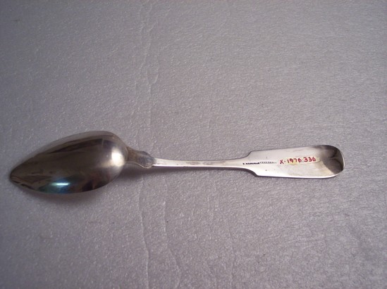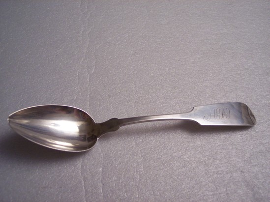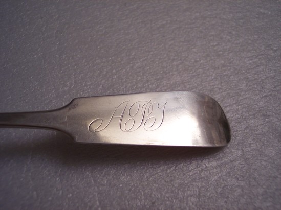 Large silver tablespoon. Engraved on front of handle "APT" in script. Hallmark on back "RMERRIMAN" "PURE COIN" both in rectangles