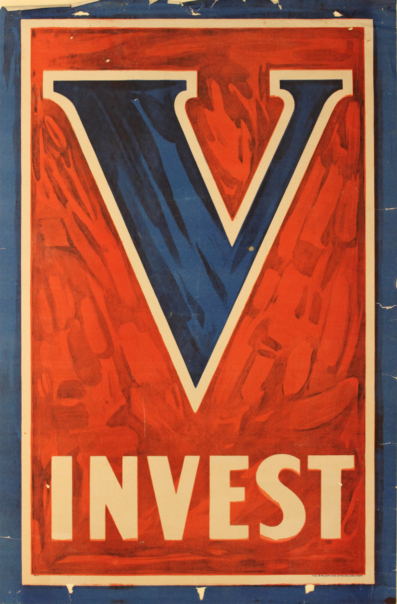 World War I era poster. Two-color ink on rectangular paper, showing a blue uppercase "V" with a white border set against a red background. Underneath the "V" is the word "INVEST" in white. Blue border around red with thin, white inner border. White areas are formed by negative space (where ink was not applied); paper has since discolored. Underneath the red center at lower-right is "THE STROBRIDGE LITHO. CO. CINCINNATI" in blue text, with "S.C." in blue at the lower-left.