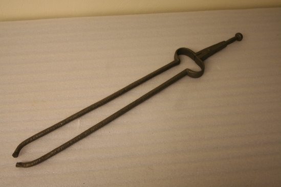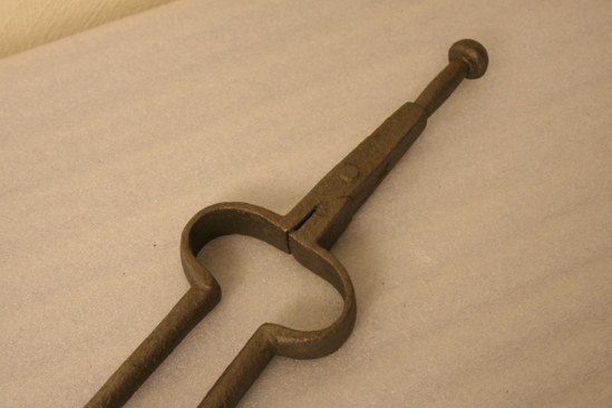Bead ends, worn, same round shaft with oblong profile bow at top. Scissor tapered square handle with round short shaft on top below mushroom knob