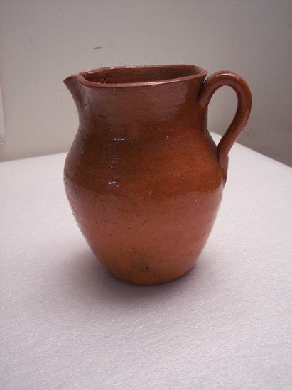 small stoneware pitcher with burnt orange colored glaze. Glazed inside and out. Small ear shaped handle on one side. Lip with divet to aid in pouring of liquid.