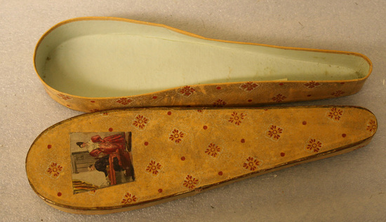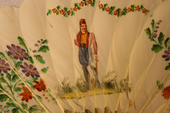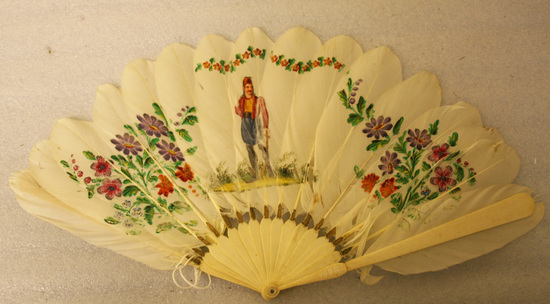 A: Fan - Ivory sticks with a white feather extending from the top of each stick to create the body of the fan. The feathers have been painted with floral design on each end in red and green. Turkish soldier painted in center. B: Box - Rounded on one end and slightly tapered at opposite. Covered with yellow paper with red stamped design. Picture pasted on front of man sitting at table and woman standing behind him in ca. 1840 clothing.