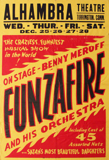Yellow poster printed with black and red words, "Alhambra Theatre Torrington, Conn./ Wed.-Thur.-Fri.-Sat./ Dec. 25-26-27-28/ The Craziest, Funniest/ Musical Show/ in the World/ !/ On-Stage-Benny Meroff/ in/ Funzafire/ and his Orchestra/ Including Cast of/ 45/ Assorted Nutz/ with Satan's Most Beautiful Daughers."