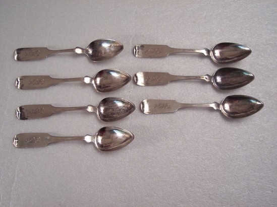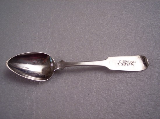 a-f) 6 silver teaspoons, engraved "EWH" for Elizabeth Williamson Hunt on handle, point bowl, flared hip, flared stem with round shoulders and rounded yoked turned up end. Hallmark on back of handle "TWNEWTON" in box, "P (image of eagle) W & H" g) 1 silver teaspoon, with engraved "EWH" for Elizabeth Williamson Hunt on handle, point bowl, flared hip, flared stem with round shoulders and rounded yoked turned up end. Hallmark on back of handle "G. BROWN"