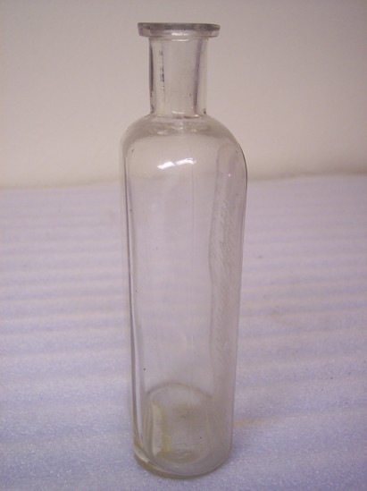 Presciption bottle. Clear glass. Flat front and back with round shoulders. Embossed on front, "Edward W. Merriman Ideal Pharmacy Bristol, Conn" Embossed on bottom "W.T.&Co. Pat. 5 Mo. 7.78a" Seams on sides and around bottom edge.
