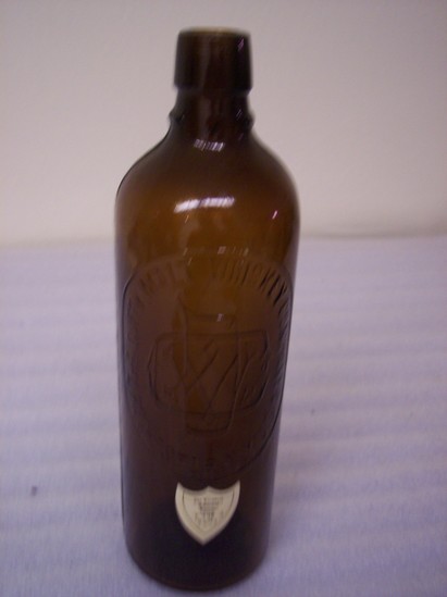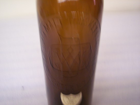 Brown two mold bottle with tapered collar neck, horizontal bar just down from neck. Impressed into side of bottle "THE DUFFY MALT WHISKEY COMPANY, ROCHESTER, N.Y. U.S.A."