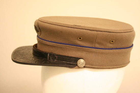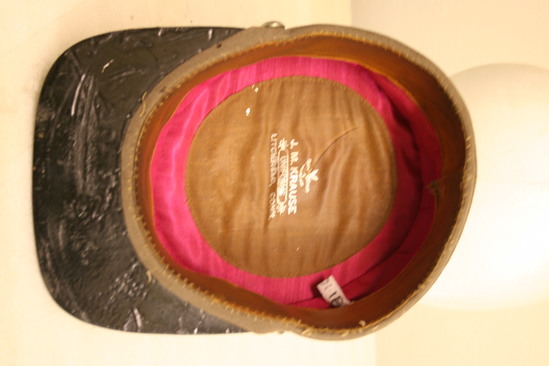 Stiff brown wool cap with leather bill, strap and sweat band; magenta fabric lining; large stiff fabric label inside - "Helmet Brand Reg. U.S. Trademark J.M. Krause Uniforms Litchfield, Conn" dark blue fabric stripe around body with patch center front above "L.F.D." in silver cord; strap terminates in small brass buttons with "FD" logo, top one missing