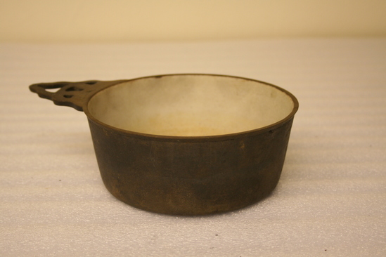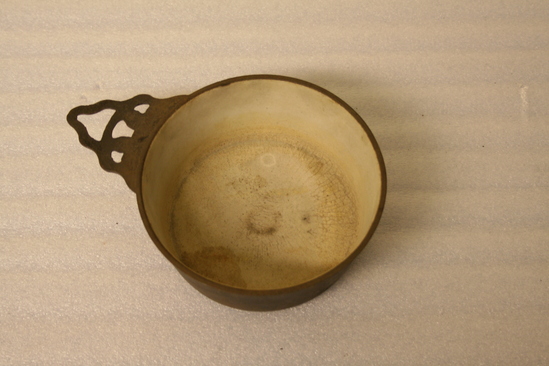 Flat botton, tapered sides; triangular rim profile with white porcelain lining. Bowl cast in two parts. Triangular handles with rounded edges. Three small and one large perforation.