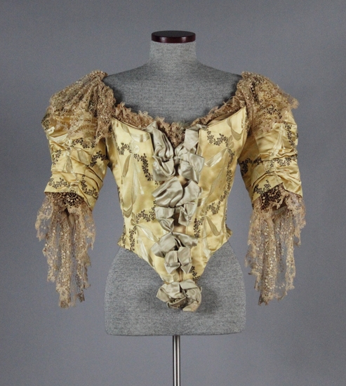 Yellow silk bodice with pale champagne ribbon and bow design with gold thread flower chain design on fabric; ecru lace at cuffs and neck; bodice pointed in front and back at waist line; modified puff sleeves; short shallow V neck with 4 wired ribbon and bows on front; lined with brown silk; white silk padded stays; white grosgrain ribbon printed with label "Paris/Worth/Paris"