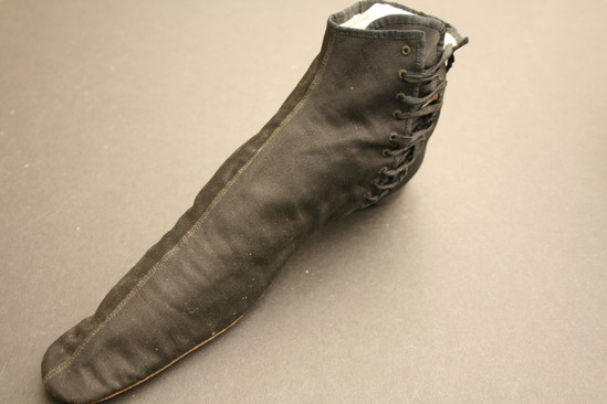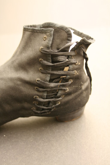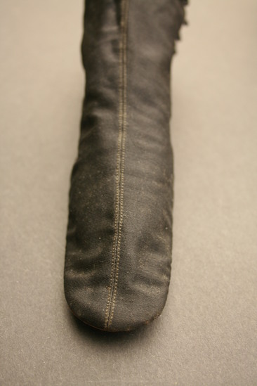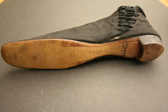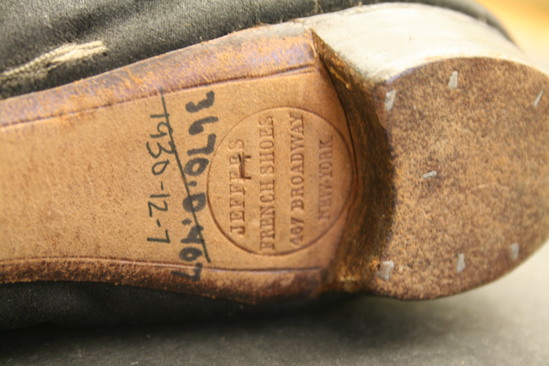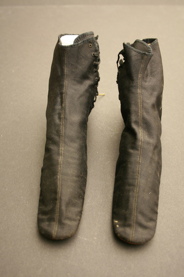 Black heavy silk (or prunella) shoes with lacing at sides; seam up center of shoe; inside lined with white cloth; brown leather sole with rounded toe and stacked leather heel painted black; on bottom of sole is stamped "Jeffers/French Shoes/467 Broadway/ New York" written in ink on inside of tongue of shoe "Miss Shaw"