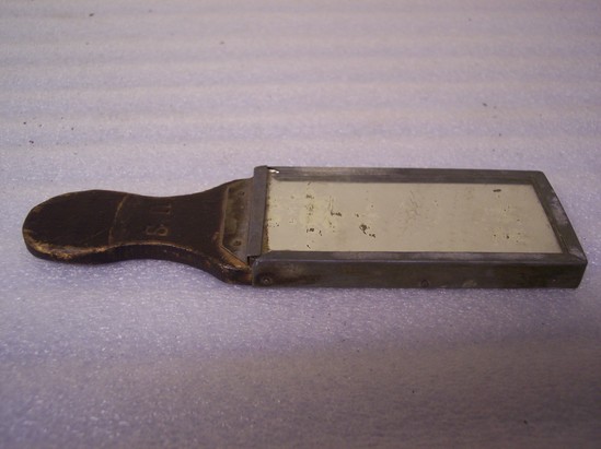 The rectangular mirror is mounted on a piece of pine with a shaped handle at one end. The mirror is held in place by thin bands of zince which is bent to form a frame and extends down on three sides of the wood and is tacked along the edges. Probably made in Connecticut. The zinc could have been scraps which left over by clock makers. "US" branded into handle. "MHC" carved on back.