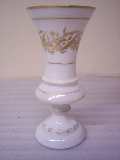 Milk glass double dome base with gilt vine painted on, ringed neck, mushroom collar, with ring on top and trumpet upper section, gilt lines of edges and gilt leaf band on trumpet section.