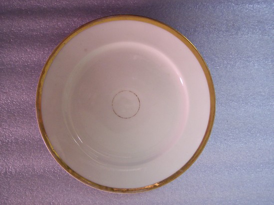 Round, white plate with wide gilt band on the edge and a small gilt circle at the center.