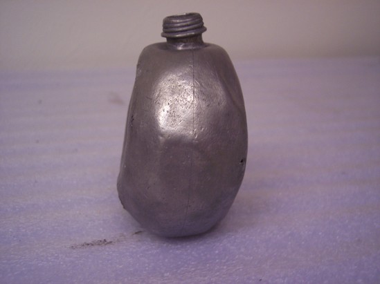 Canteen shaped container, scored with 2 concentric circles on either side, screw top. Silver mouthpiece missing