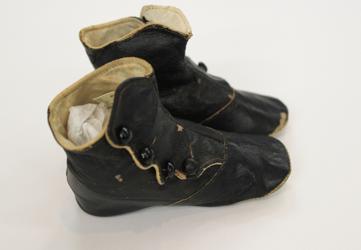 Pair of black leather child's shoes / boots; ankle boots; scalloped edges with tan leather edge and four buttonholes and four wood buttons; light tan cotton lining; light tan leather soles; stamped on bottom: "3"