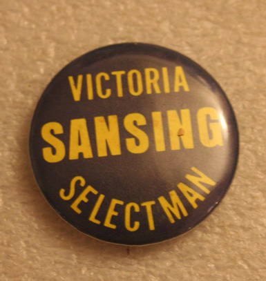 Round metal pin-back button with straight pin on back. Front blue - in yellow lettering "Victoria/Sansing/Selectman" Thin layer of plastic over top of button.