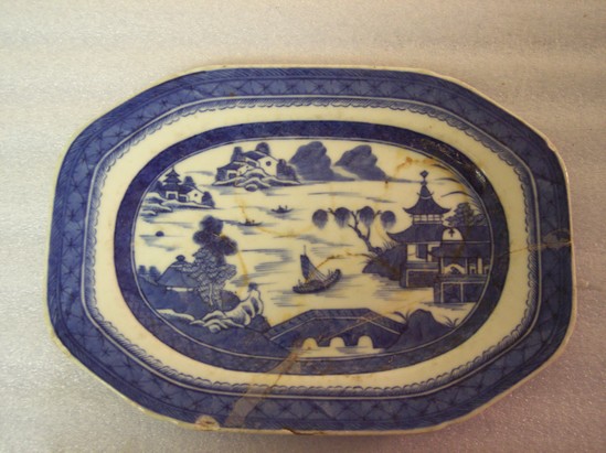Blue and white chinese expoert porcelain hexagonal platter, transfer pattern with traditional harbor scene.