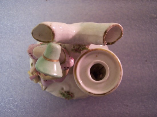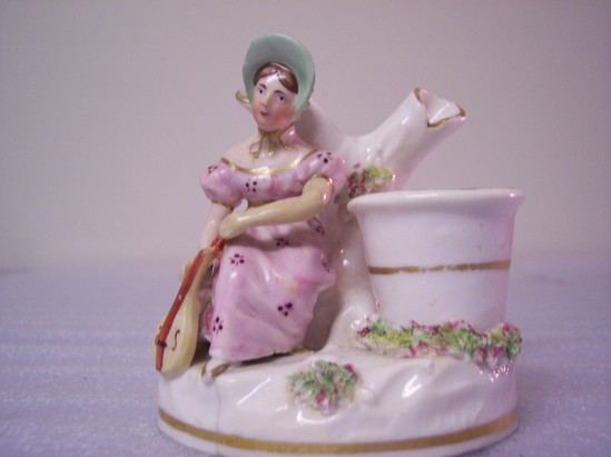 Oval base forming ground with ring of flowers surrounding curved wall with gold bands serving as inkwell. Bifurcated tree in back with two large hollow branches serving as pen holders. It has a small, colored floral spray attached to main trunk. Girl in pink empire dress with green bonnet hold lute and sits on floral covered rock. Hollow base.