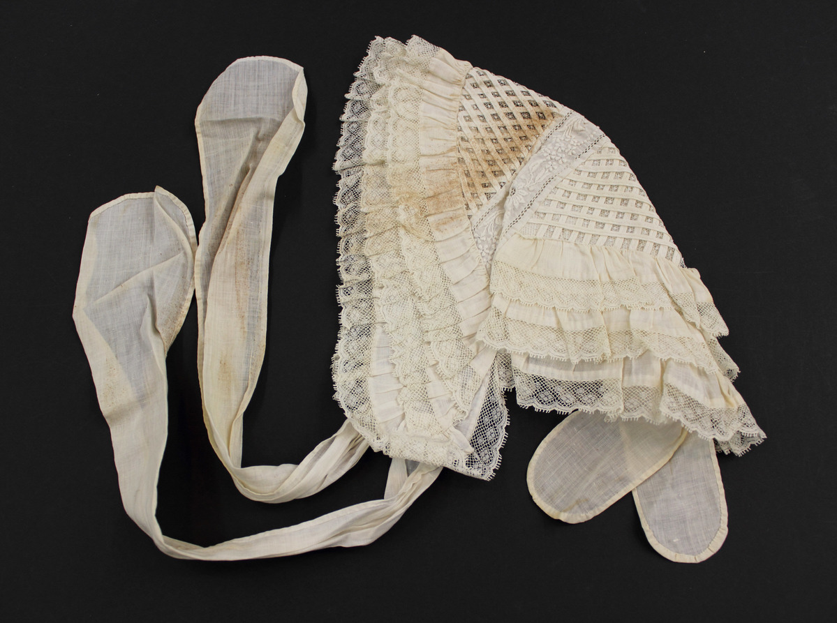 Off-white cotton child's bonnet; triple lace ruffles at front and neck; lattice bands and lace at crown and back; eyelet lace insertion; fabric pulls at center back; fabric ties at extended front ruffle