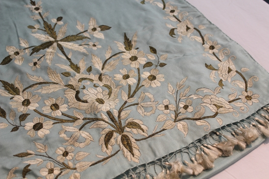 Long turquoise blue shawl; at each end is embroidered floral design in white silk and gold metallic thread; fringe of blue silk twisted thread with white tassel