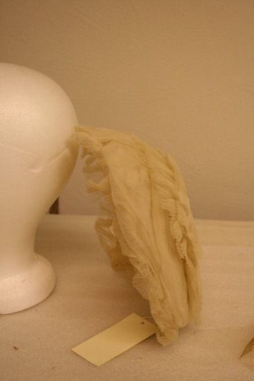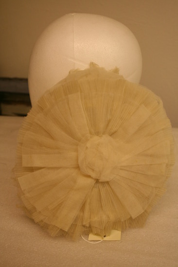 Shallow, oval shaped cap; white net interior; crimped whtie cloth in layers in circular pattern with ball in center of hat; one layer crumpled white cloth; label "Made by Madame Dumest, successor to Madame Larmande 10 E. 22nd St. New York"