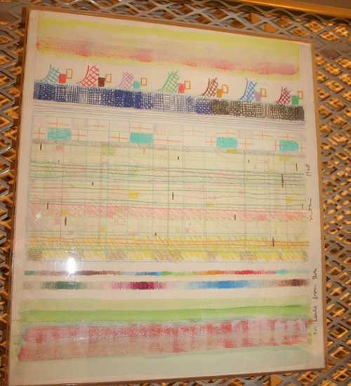 Wide vertical strips of color, gouache, beginning on left with a very pale, translucent green, then varying shades of green and red - intermixed colored strips. In the center are horizontal and perpendicular stripes irregularly spaced. Towards the right the entire pattern is changed and an apparent switch to crayon or chalk. Right border is a translucent yellow-green with shades of red blended in. Evidently an experimental use of mixed media. Across the bottom in pencil " For Leslie from Bob Natkin 1968" Framed in lucite shadow box like frame.