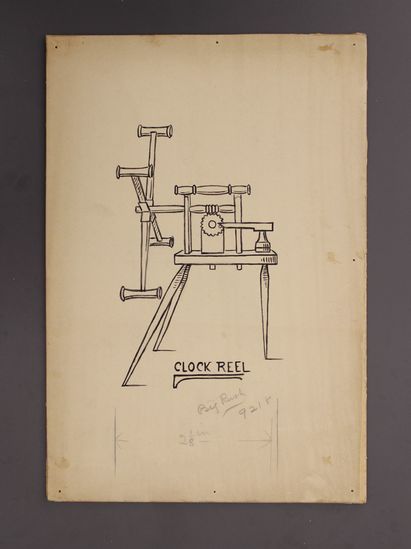 Illustration on board executed in pencil and black paint. Artwork depicts a three-legged, wooden clock reel.
