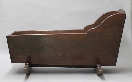 Canted single board foot, keystone shaped single board canted head. Sides, single boards with 1/4" round and shallow cyma curve, rising 7" to head. Single board bottom. Dove-tailed. Vertical brace mortised in. Rockers: crescent with curved tops.