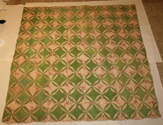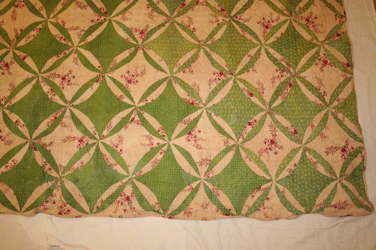 Patchwork quilted coverlet, Orange Peel design, in three printed cotton calicos; one - green and yellow ivy leaves on green ground, two - random sprigs of red and white roses on natural ground, worked into orange peel design, three - small green flowers with yellow center on green background. Quilted in diamond pattern. No stuffing. Linen backing. Binding of white floral cotton.