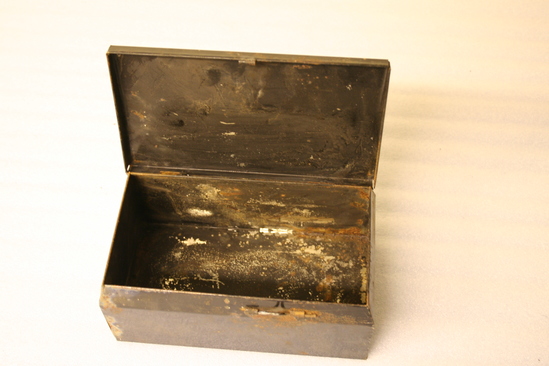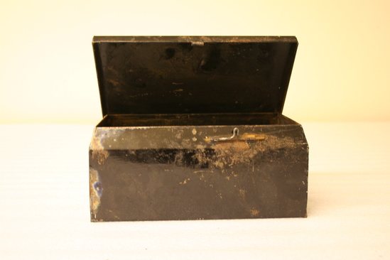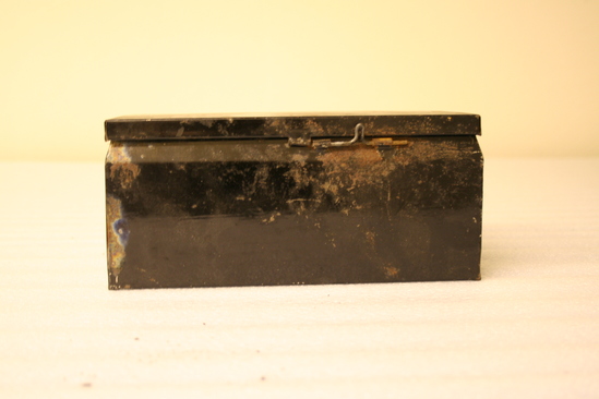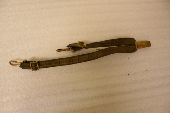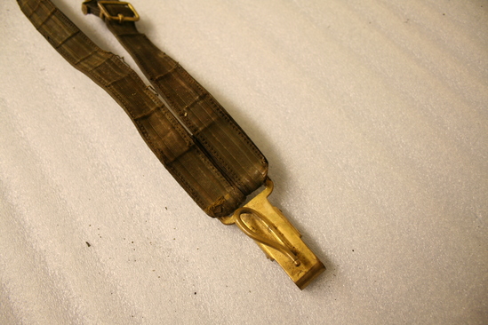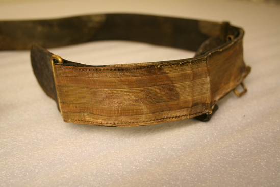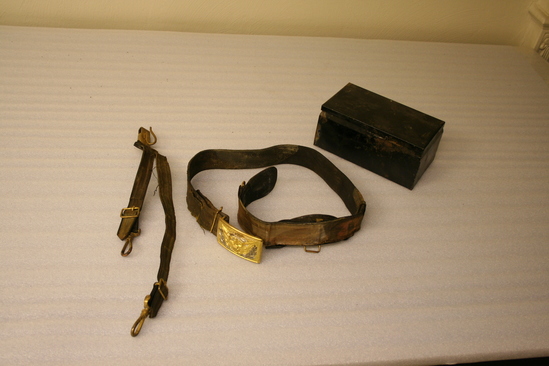 A,B: Belt to accompany military uniform. Leather belt with gold metallic striped fabric on exterior. Brass and silver buckle with eagle with wings spread. B: accompanying piece to belt which allows sword to attach to belt. C: Japanned tin box, hinged lid