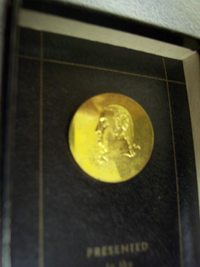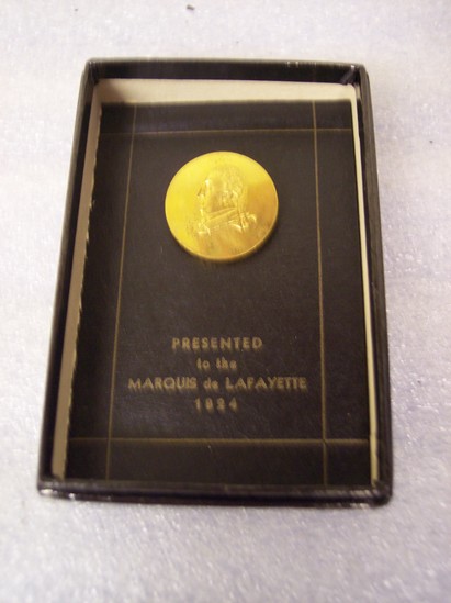 Round gold button with raised image of profile of Marquis de Lafayette. Housed in cardboard box covered in blue glossy paper. Button attached to cardboard backing. Border of thin gold line around button. Printed underneath button "Presented/to the/Marquis de Lafayette/1824"