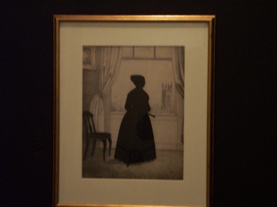 A. Profile of a man facing right with arms folded. In black paper pasted to a lithographed background, corner of room subject looking out window, mantel behind him with vase, figured rug, hearth carpet, framed print above subject. B. See 8646 same background. Profile of woman with fan, cap, in black paper. Background lithograph of window with steeple of Trinity Church, Hartford, in background. Left empire chair, figured carpet.