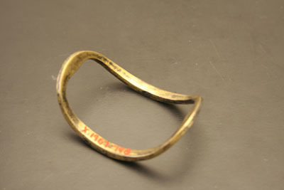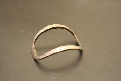 Single oval shaped shoe buckle. Rounded shape. Front of buckle has etched design of small dotted border with larger floral shapes in center. Center rod and tongues missing.