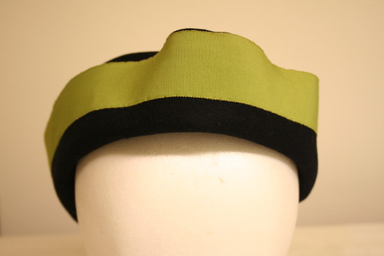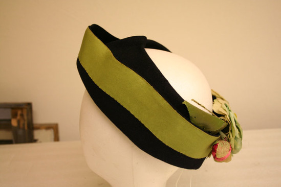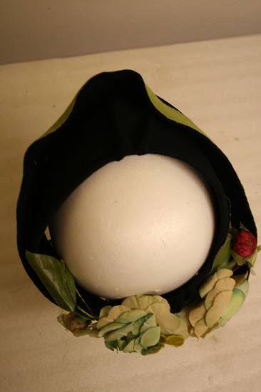 Circular band, folded nearly in half and gathered in front to make point; open to top; trimmed with lime green grosgrain ribbon; in back, two large blue and white cloth flowers; two red buds and paper leaves