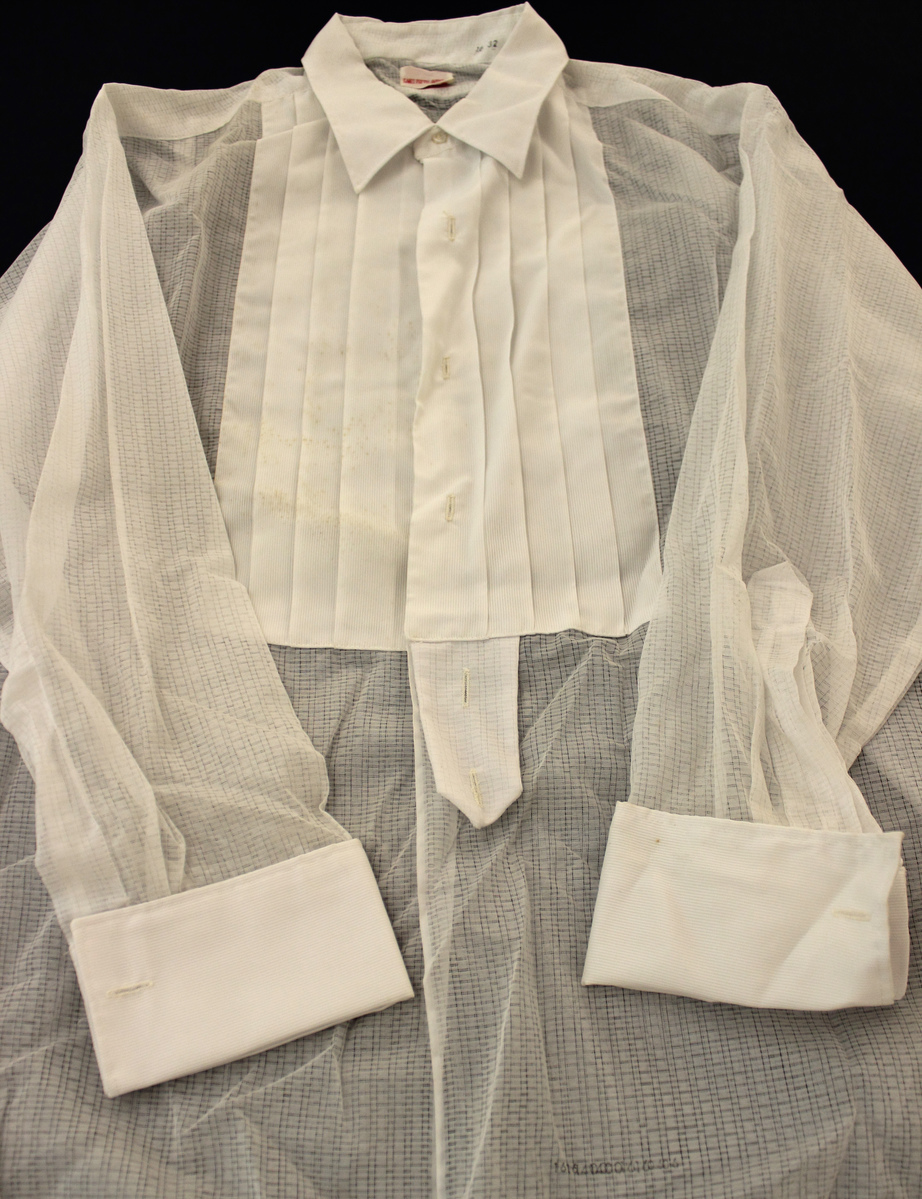 White men's tuxedo shirt. Sheer patterned weave with ribbing. Pleated front panel with one button at neck and buttholes for studs; tab at center-front for buttoning to trousers. Shirt collar, long sleeves with French cuffs. White woven label with red lettering at center-back, "Saks Fifth Avenue." Stamped size at center-back left, "16/32"; white woven label on right-front inside, "Dupont Dacron"; stamped laundry mark on left bottom.