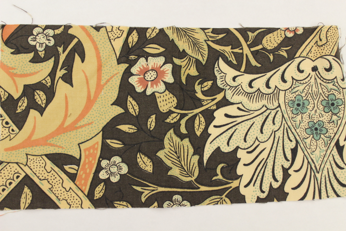 Rectangular fabric swatch made of cotton. Dark gray background . with a large white and blue flower and tan, pink and blue leaf design. Smaller tan leaves with blue and black dots run behind this design. In the large floral and leaf designs, small blue dots cover half of the leaves. Fabric is smooth to the touch.