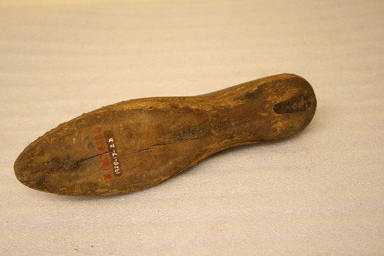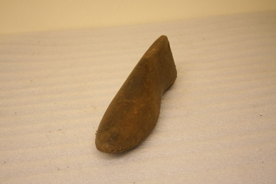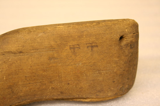 Wooden shoe last. Small adult or older child size. Pointed toe. Hole drilled through top of heel. Branded "TT" on one side. Piece of leather on bottom of last near heel.