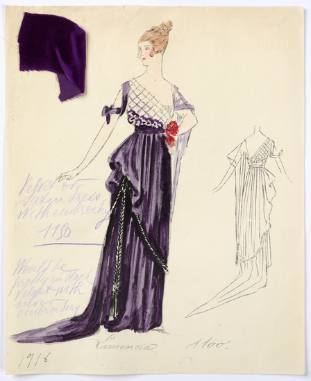 Lithograph and watercolor on paper fashion design. Velvet or satin dress with embroidery. Fabric samples accompany rendering.