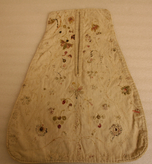 Woman's pocket. Made of linen. Edges and opening bound with linen. The front of the pocket has an all-over pattern of meandering vines with flowers. There is enough crewel left to show the colors and most of the stitches. The holes were the wool thread is gone shows the outline of the pattern. The back of the pocket is two pieces of linen sewn together. Interior lined in plain linen.