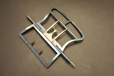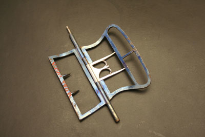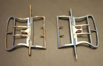Pair of shoe buckle tongues. Decorative buckle missing. Metal rod in center with two tongues hinged off of rod. One tongue square shaped with two small prongs pointed back towards center. Second tongue has rounded corners. Small two pronged piece overlaying this tongue