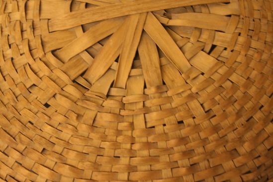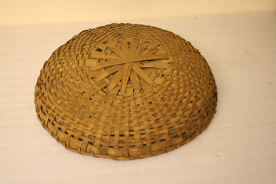 Basket cover; saucer shaped; woven wood splints; rayed center with heavy outer wood strip