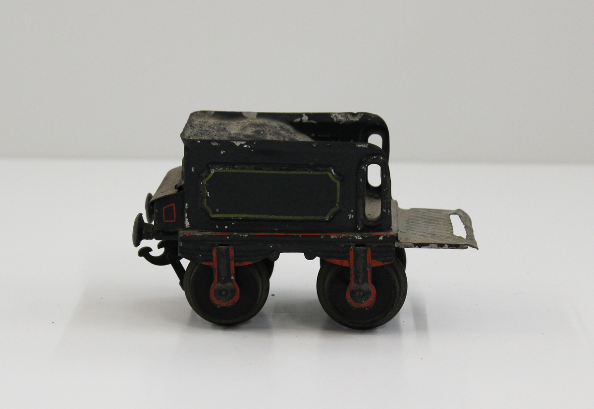 Early 20th-century tinplate locomotive tender, likely made by Märklin. Black tender with red and yellow detailing and four black wheels. Tender has three-sided container with with textured metal inside (to represent coal), a short platform extending from the front to connect to a locomotive, a narrow box on the back with a hinged lid, two buffers, and a coupling system for attaching boxcars. No markings on bottom, but was donated attached to 2016-52-4.
