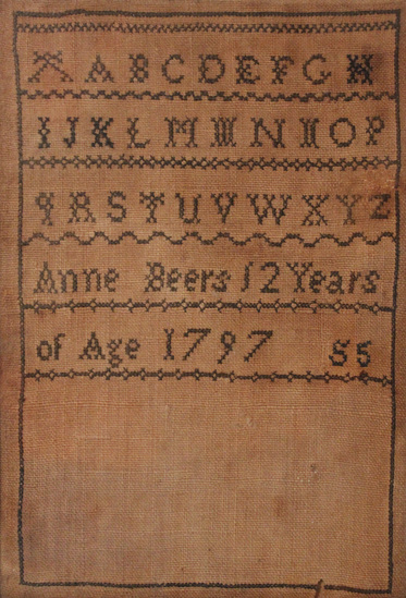 Marking sampler executed in brown thread on cream colored linen. Sampler contains five rows of marking. The first three are all of the letters of the alphabet in capital case. The last two rows read "Anne Beers 12 Years/ of Age 1797 S5."