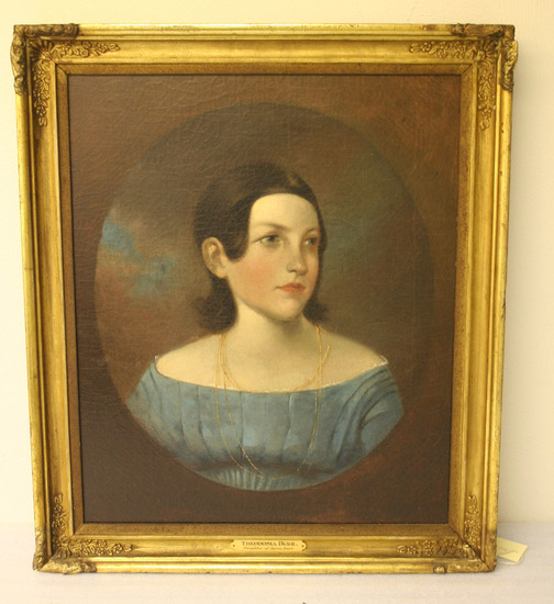 Oil on canvas bust portrait, an oval within a rectangular picture, of a young woman, dark brown hair straight to shoulder, black hairband placed askew toward front, blue dress, off the shoulder and with empire waist, white lace trim around neckline of dress, three stranded gold necklace. Framed in wooden frame with floral plaster decoration in each corner, gilded.
