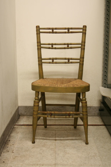 One of a set of six side chairs; "faux bamboo" style; green glazing over yellow paint; converging rush seats with shaped band around seat; plain back legs below seat with bands of red paint above seat; three double rails with three red bands with ball connected two bands in middle at back of seat; two plain side stretchers, one plain back stretcher.
