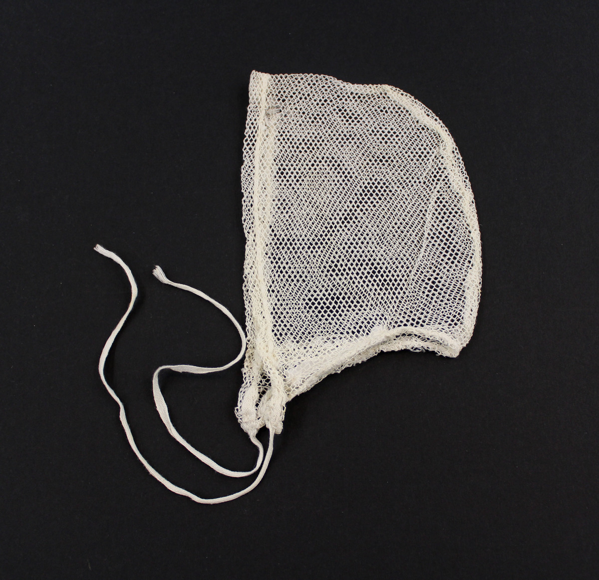Off-white cotton net child's bonnet; drawstrings at neck that go through a front casing