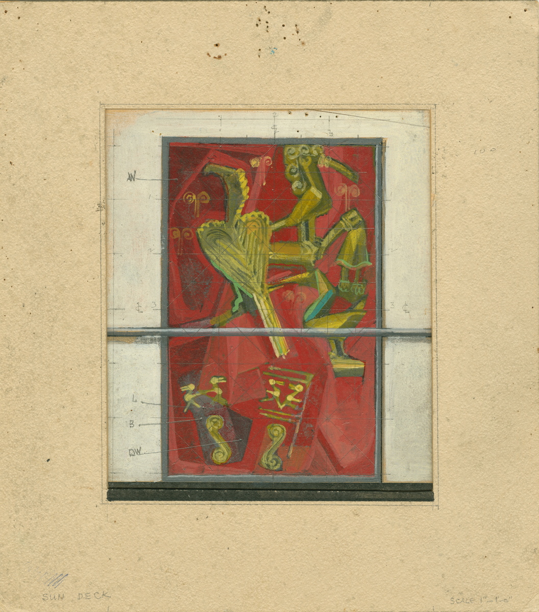 Sketch on mat board of gold and green figures set against a background of various shades of red. This rectangular red background is bordered with a thin gray boarder against a white background. There is a thin gray bar running across the lower half of the sketch. What appears to be a penciled-in grid divides up the rectangular colored part of the sketch. On the bottom left hand corner in pencil is written: "SUN DECK". On the bottom right hand corner is written: "SCALE 1"-1'-0"." On the back of the mat board in blue ink and pencil is written: "Sketch for Mosaic/Santa Magdalena/Grace Line/1962."