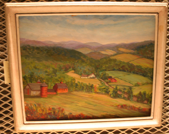 Oil on composition board of a landscape scene. Rolling land with hills in background. Much of the land cleared for farming but some forested area visible. Farms on left hand side of painting. Red barns and outbuilding. Blue sky with wispy white clouds.