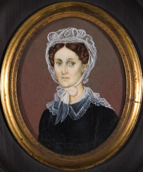 Watercolor on ivory. oval miniature. Woman faces front left. Wears fancy loose cap that ties under the chin. Also small mull fichu over high scooped neckline, high belted black dress that buttons down the front. Has parted brown hair with side curls, blue eyes. Maroon background.