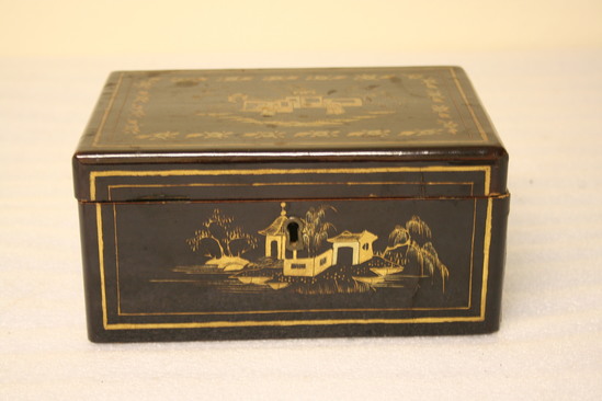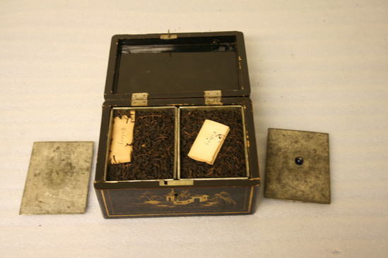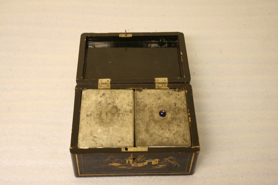 Wooden tea box, lacquered black on outside. Gold stencil design of Chinese buildings and of two men on top of lid. Hinged lid on top. Inside contains two tin containers for storing tea. Floral design punched into covers of tin containers.